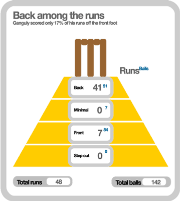 When in form, Ganguly favours scoring off the front foot, but today he struggled, making just seven runs off 84 balls when playing forward. He was much more productive playing back, scoring 41 from 51 balls. Laxman was comfortable off either foot, scoring 28 runs when playing forward and 20 off the back foot.