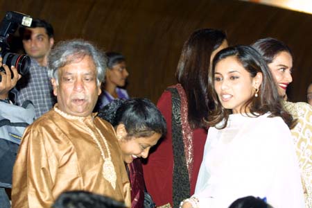 Kathak dancer Pandit Birju Maharaj choreographed some sequences for Madhuri in Devdas. Seen here with Rani Mukherjee and Rekha (far right).